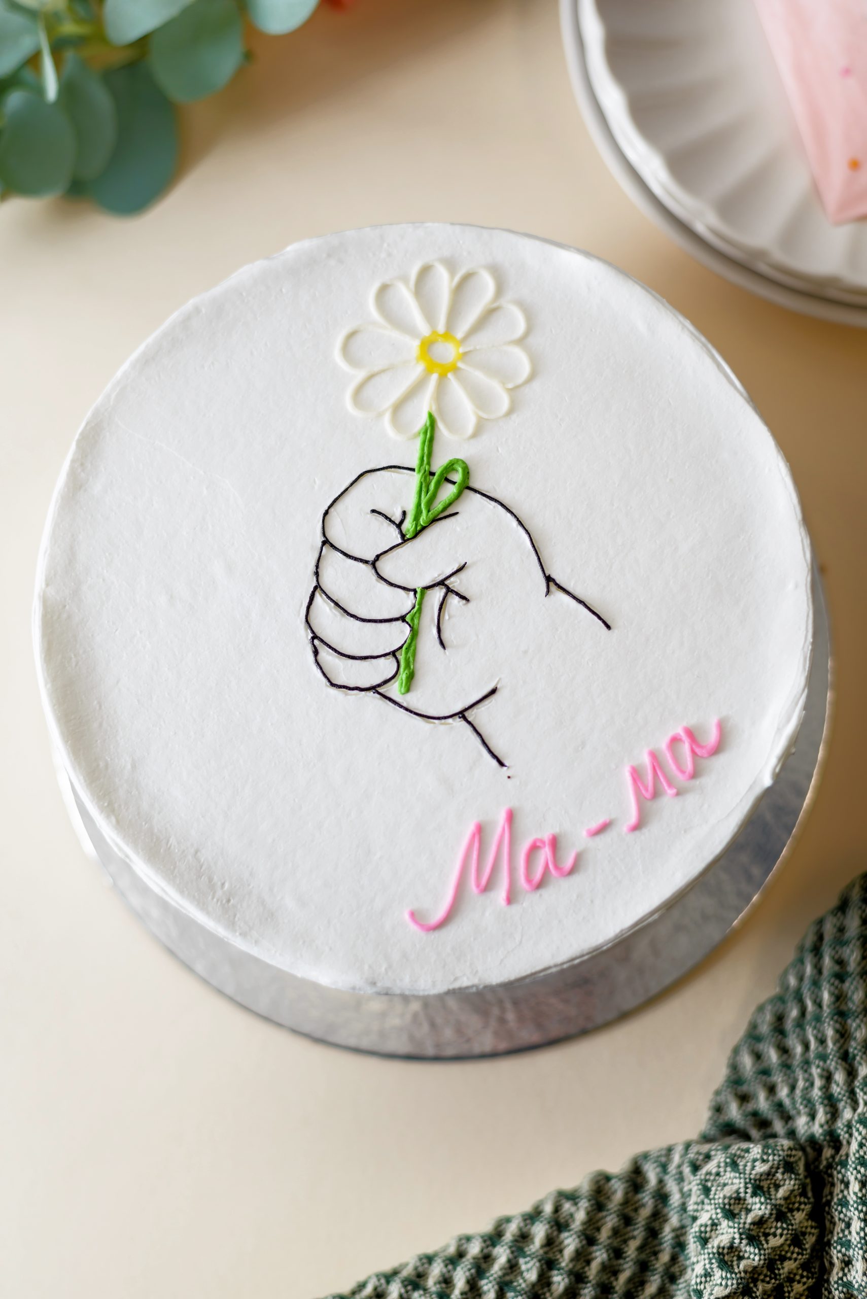Торта со илустрација на рака што држи цвет, симбол на искрена љубов, благодарност и нежност.